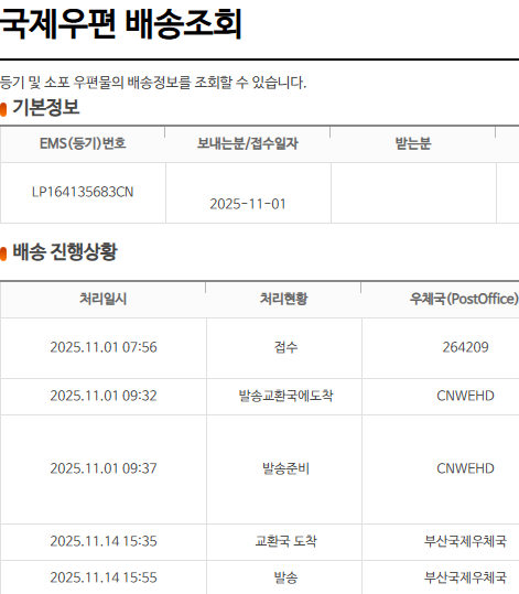 LP164135683CN 11월 1일에 접수됐고, 오늘 교환국 도착 떴습니다